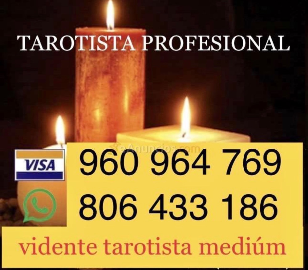 Vidente tarotista desde hace años, mi Teléfono de tarot y videncia : 806 433 186 y por tarjeta teléfono 960 964 769 , desde fuera de ESPAÑA teléfono 0034 960 964 769 videncia de nacimiento y experto en temas dolorosos, especialista en amarres y magia blanca , No necesito que me cuentes tu problema, mi obligación y mi trabajo es descubrirlo así como solucionarlo, fechas y datos concretos, tarifas económicas y trato impecable, yo no tengo clientes tengo amigas que me consultan con la sana voluntad de encontrar respuestas . Llámame atiendo yo personalmente, sin mentiras, con respuestas claras y fechas concretas. ( cuando estoy ocupada te atiende mi compañera para poderos atender las 24 horas sin gabinetes ) Provincias de España : La Coruña Álava Albacete Alicante Almería Asturias Ávila Badajoz Islas Baleares Barcelona Burgos Cáceres Cádiz Cantabria Castellón Ciudad Real Córdoba Cuenca Girona Granada Guadalajara Guipúzcoa Huelva Huesca Jaén La Rioja Las Palmas León Lleida Lugo Madrid Málaga Murcia.