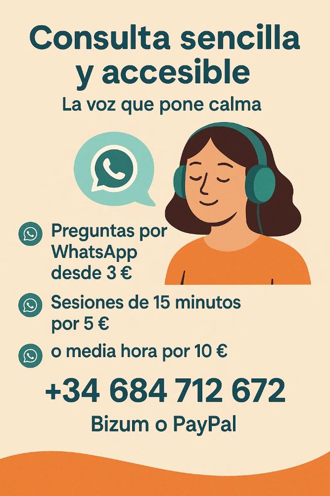 Consulta sencilla y accesible: preguntas por WhatsApp desde 3 €, sesiones de 15 minutos por 5 €, media hora por 10 € y 45 minutos 25 €