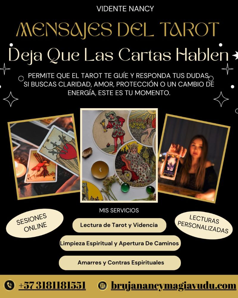 Consulta tarot del amor hoy mismo y recibe guía espiritual clara y directa. Trabajo amarres de amor en España, rituales de amor urgentes, brujería amorosa, amarre de amor rápido y efectivo. Limpieza espiritual con huevo, limpieza energética y baños de descarga para eliminar bloqueos sentimentales. Tarotista profesional con atención personalizada y confidencial. Agenda tu consulta inmediata. WhatsApp +57 3181181551